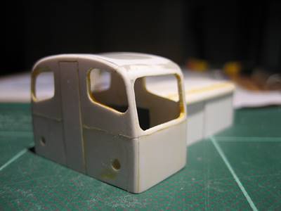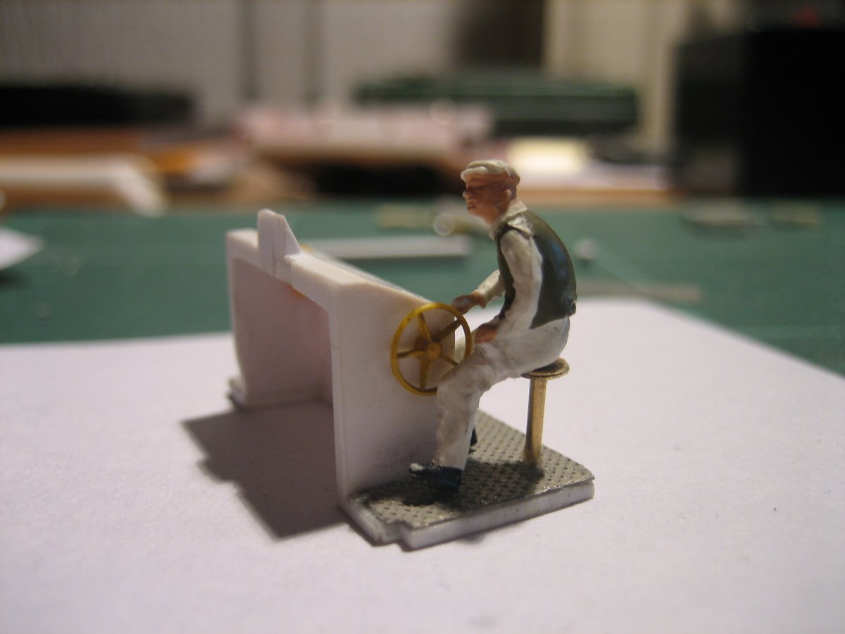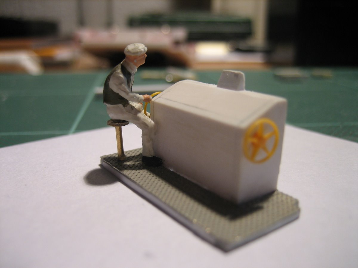 C'est donc armé d'un cutter et d'une plaque de carte plastique de 1mm d'épaisseur que je commençais le montage. Pour des épaisseurs plus importantes, je superposais les couches et pour les plus fine, ponçage au papier de verre. L'engin prend forme et se découvre progressivement. Le conducteur est de la gamme Preiser et le sol de la cabine en plaque gravée en maillechort Haxo.