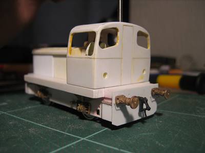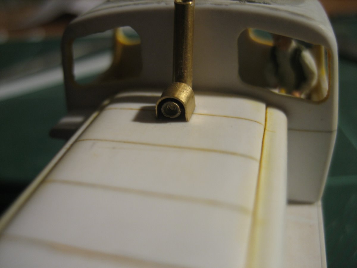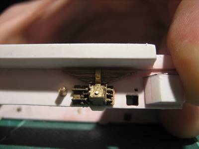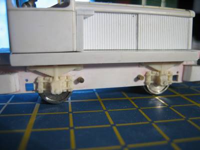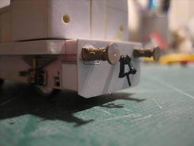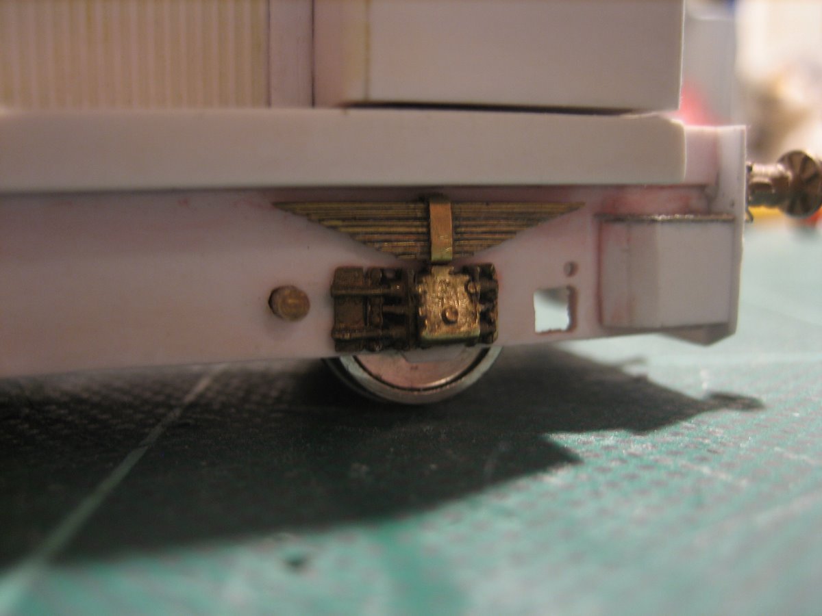 Une mauvaise modification de l'emplacement de l'attelage m'a fait reprendre à plusieurs reprises la traverse de tamponnement. Je n'ai prévu à cette époque de l'équiper que d'un seul côté d'un attelage Kadee.