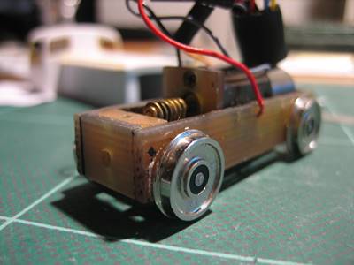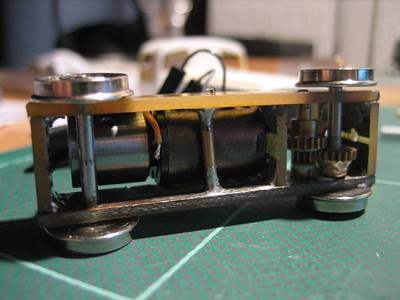 Pour la motorisation, c'était pour moi une nouveauté. Déçu du bogie moteur Tenshodo, trop rapide, j'ai ressorti mes cours de mécanique du lycée pour concevoir ma propre motorisation.